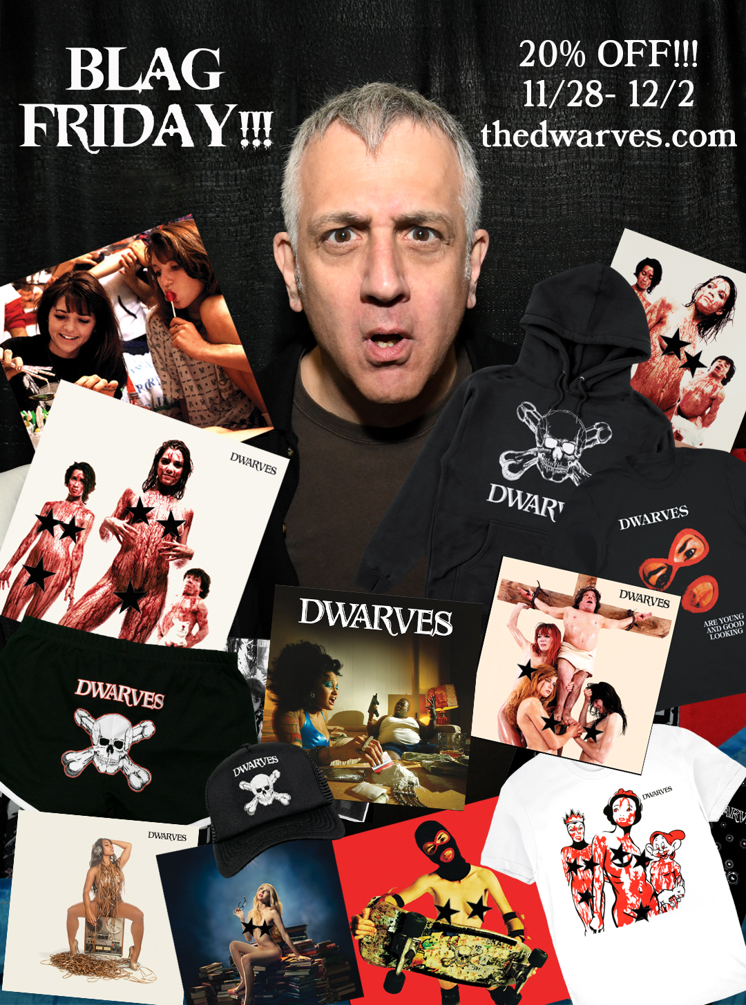 Sale starts after midnight Thanksgiving 11/28, ends Tuesday Dec 2! 20% off Signed LPs, posters and skate decks! Shirts, shorts, CDs, patches, stickers and more! https://dwarves.merchtable.com/